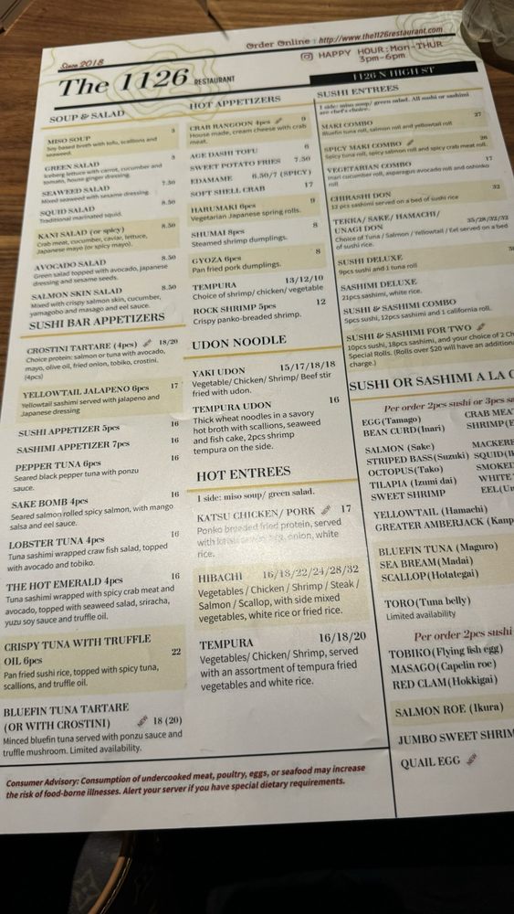 Located in the heart of Columbus, Ohio, The 1126 Restaurant offers a vibrant culinary experience steeped in Asian flavors. This trendy eatery boasts a menu that perfectly balances traditional dishes with modern twists. A highlight includes the Age Tofu, featuring gently fried tofu topped with bonito flakes—a must-try for any appetizer lover. For sushi enthusiasts, the Bluefin Tuna Special offers an exquisite selection of sushi and sashimi that speaks to the quality of their ingredients.